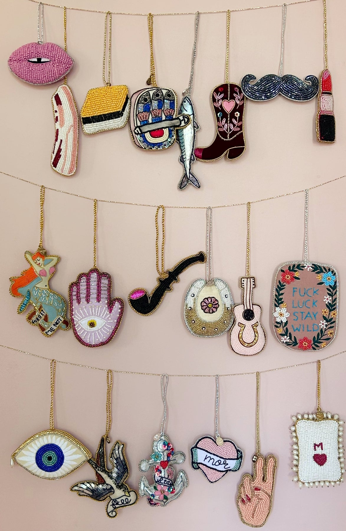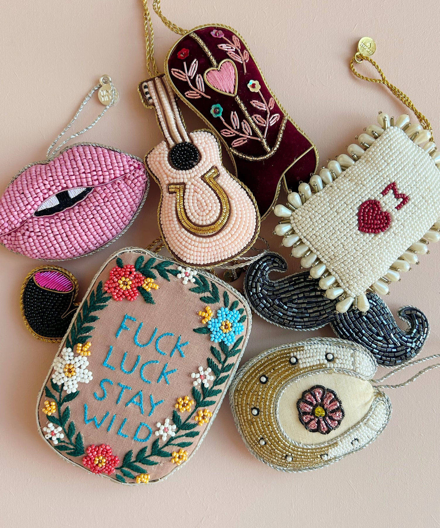 Håndbroderet cowboystøvle i håndfarvede perler, pailetter og metallic tråd.