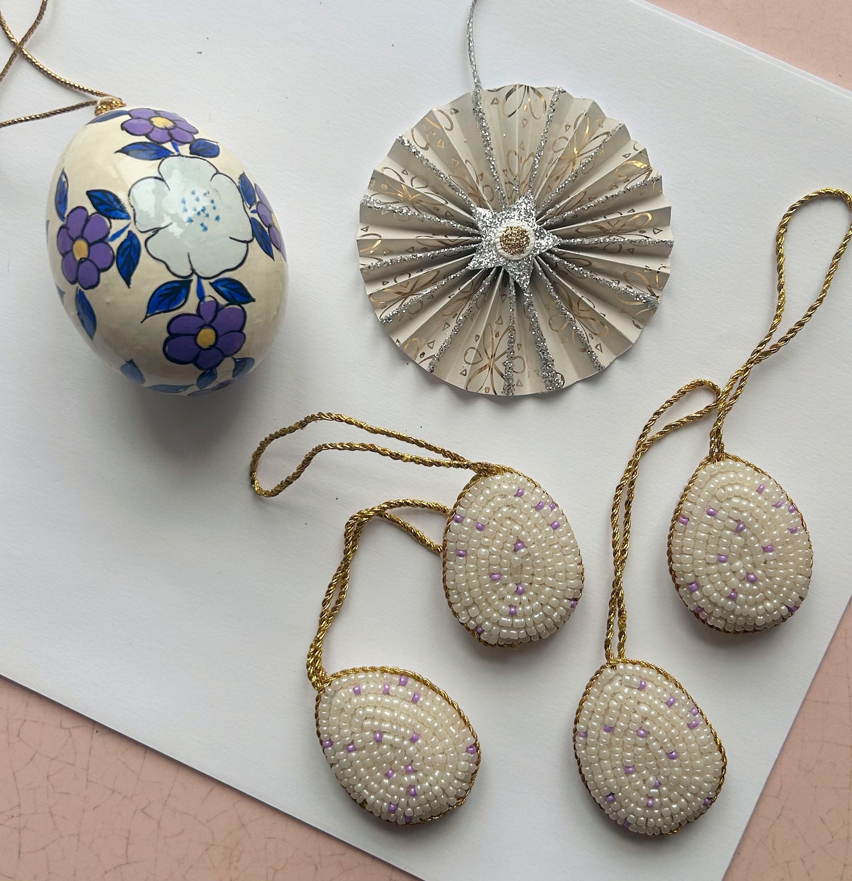 Skab en unik og hyggelig påskestemning med min håndlavede påskepynt. Hvert stykke er omhyggeligt fremstillet med traditionelle håndværksteknikker – fra perlebroderede detaljer og elegant foldet papir til smukt håndmalet papmaché og eksklusivt mundblæst glas. Vores påskepynt forener æstetik og håndværk, så du kan pynte op med noget helt særligt denne påske.