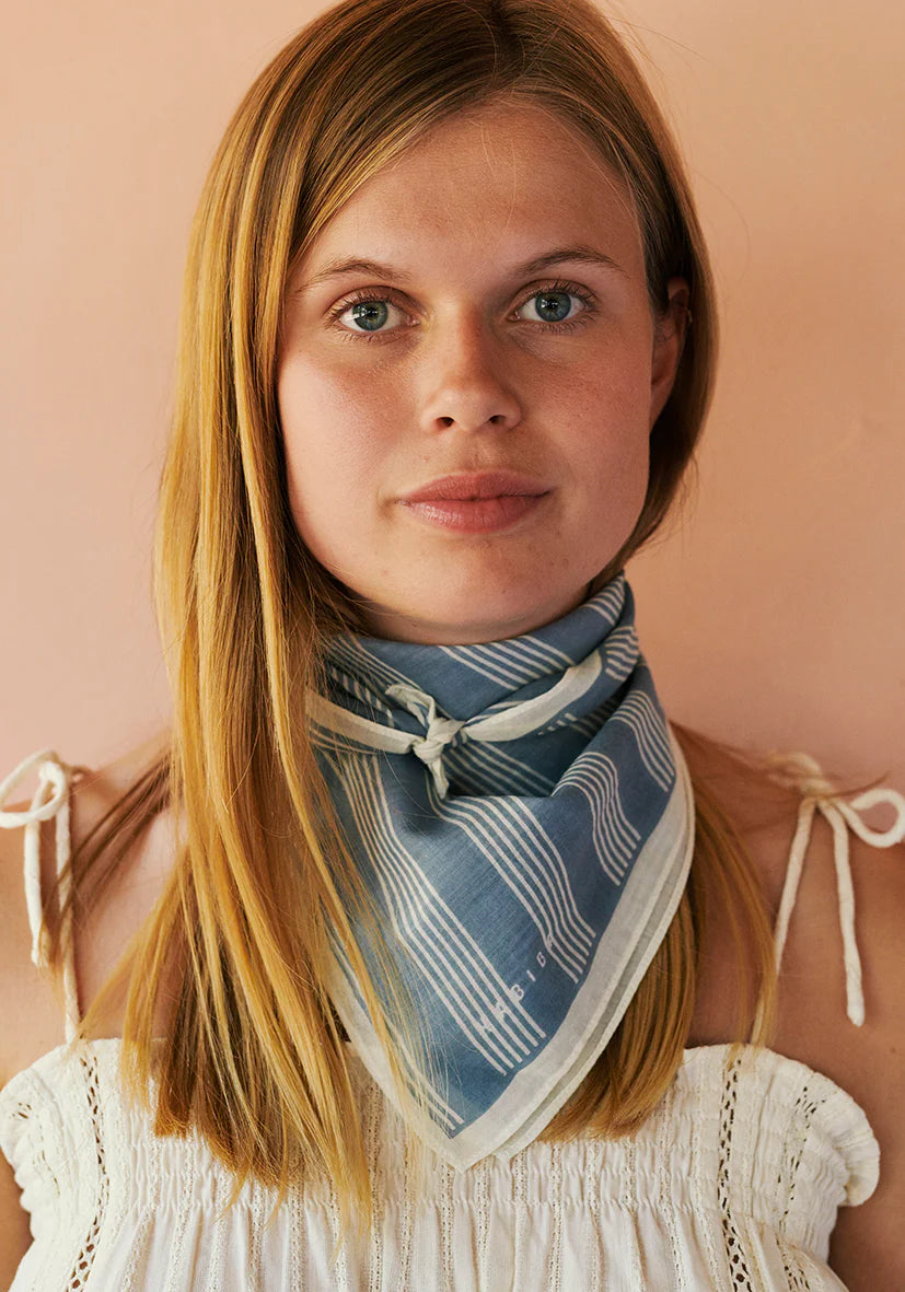 Bandana i blågrå stribe med en håndtegnet kant og et lille logo, der giver et personligt præg – skabt med kærlighed fra HABIBA.