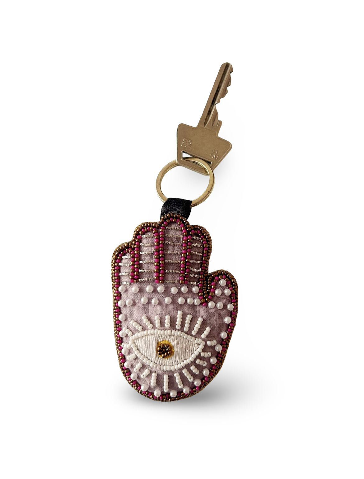 A hand-embroidered Hamsa hand keyring, crafted with intricate detail. A stylish and meaningful accessory that carries protection and good fortune wherever you go. Embroidery on both sides