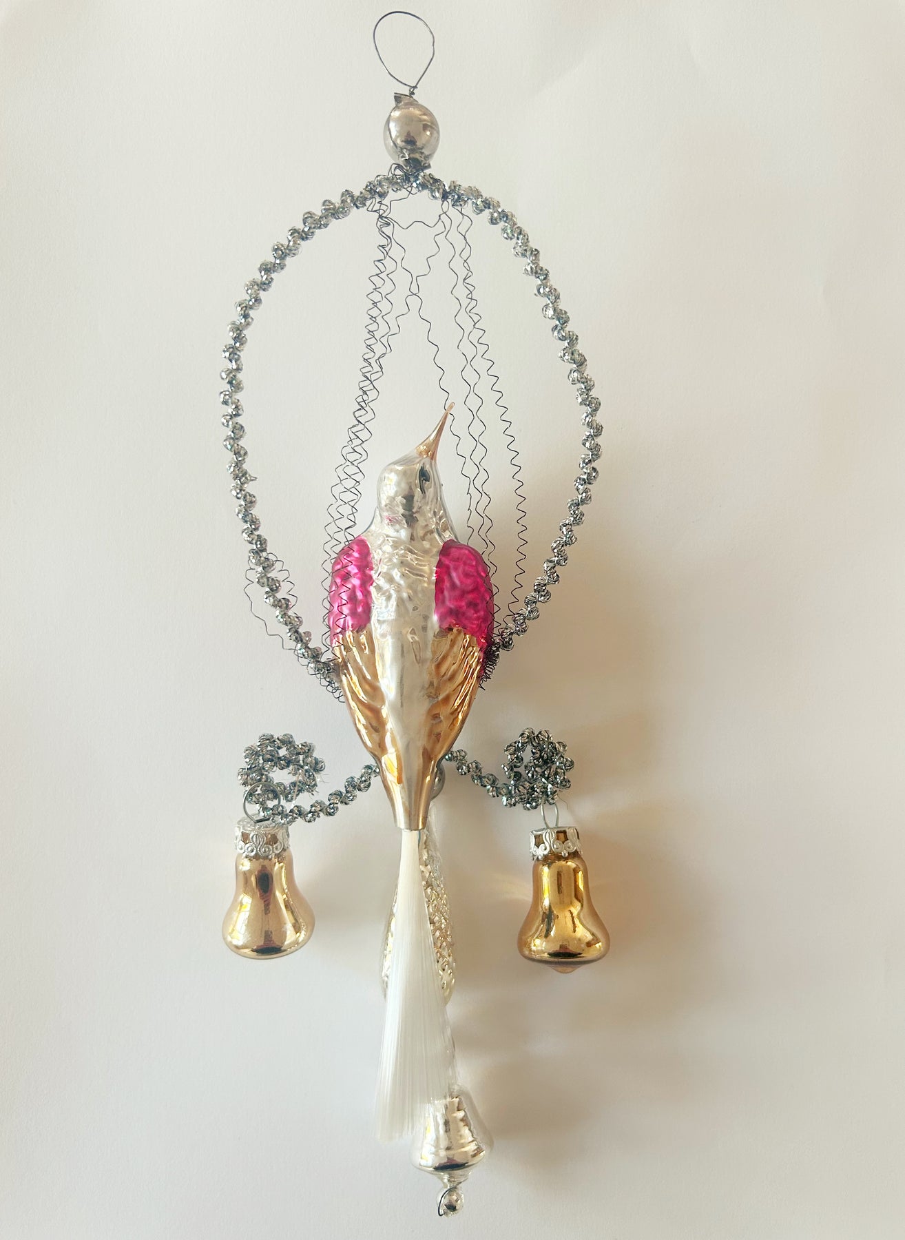 Et elegant, håndlavet juleophæng i sølvfarvet metaltråd med mundblæste perle- og glaskugledetaljer. Midt i ophænget sidder en lille fugl i rødt og guld glas med en fin hale i glastråde, Et unikt stykke julepynt, der kombinerer glans og klassisk charme.