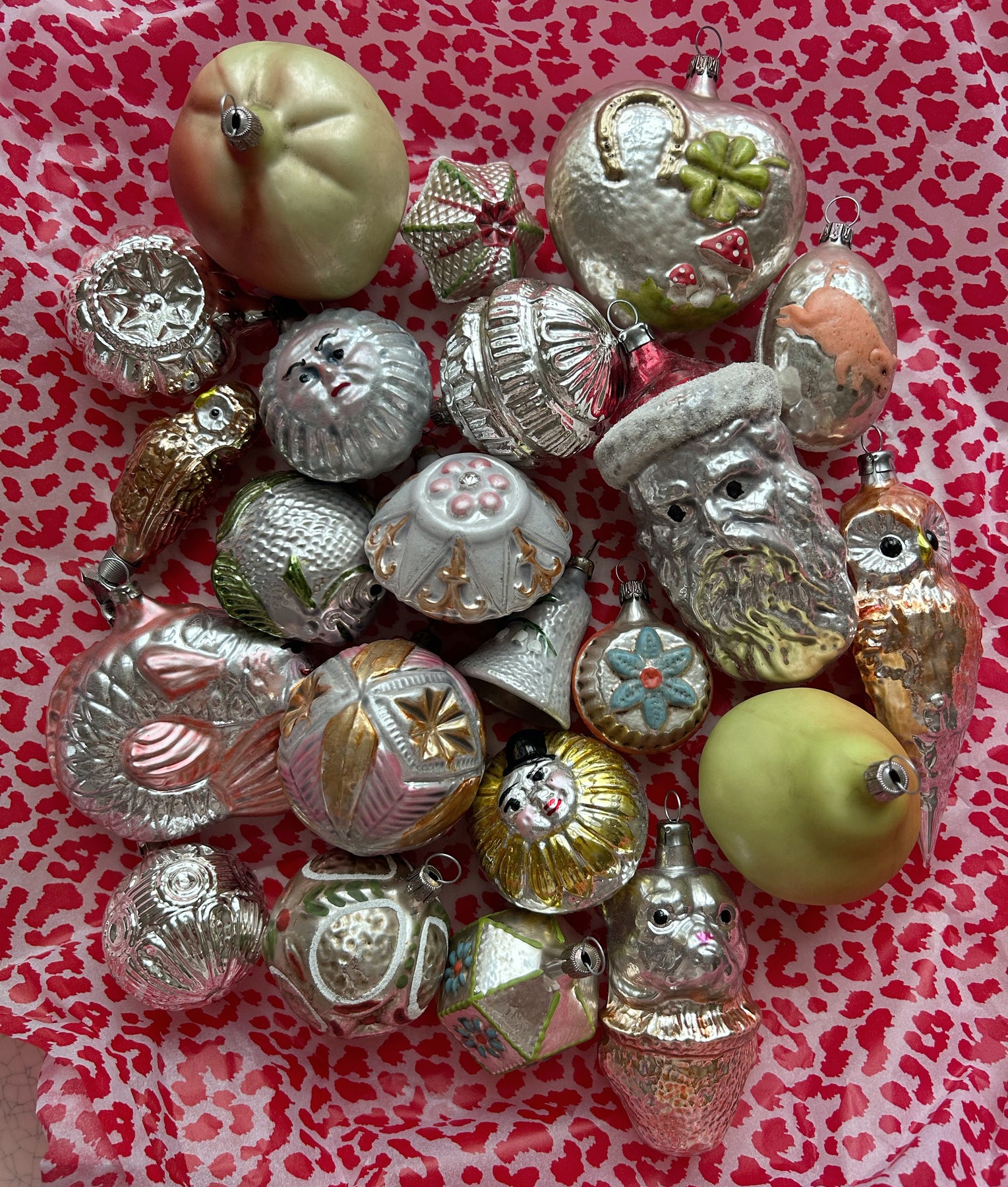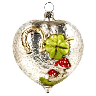 Dette smukke hjerte i glas er fyldt med nostalgisk charme og symbolik. Håndmalede ornamenter af firkløver og hestesko gør det til et ægte lykkehjerte, perfekt til at sprede held og varme på juletræet.